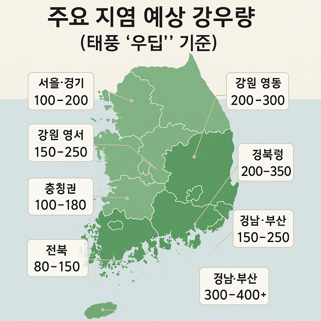 🌧 주요 지역 예상 강우량 (태풍 ‘우딥’ 기준)