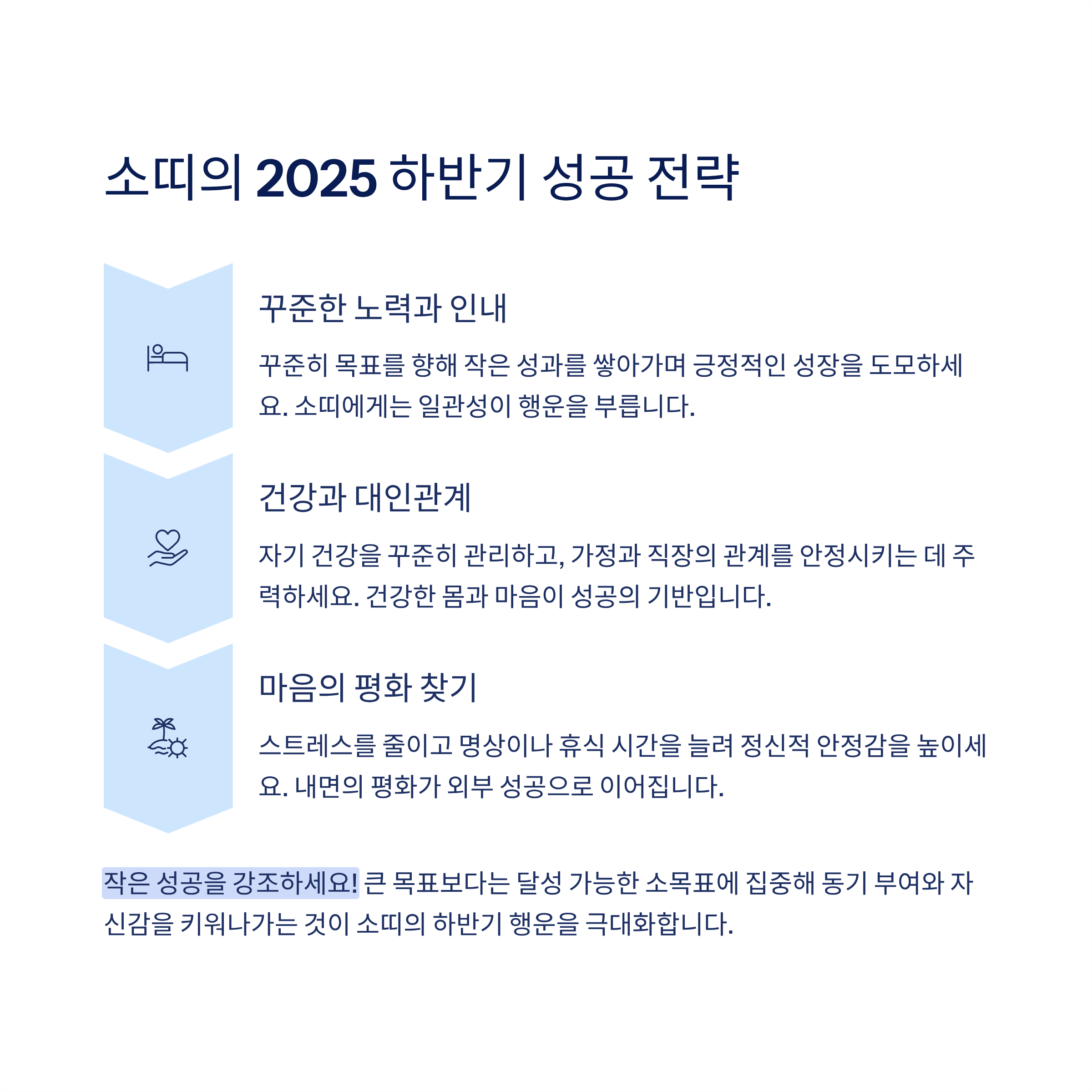 - 조급함 금지: 목표 달성에 조급해하지 말고 꾸준한 성실함을 유지하면 행운이 따릅니다.
