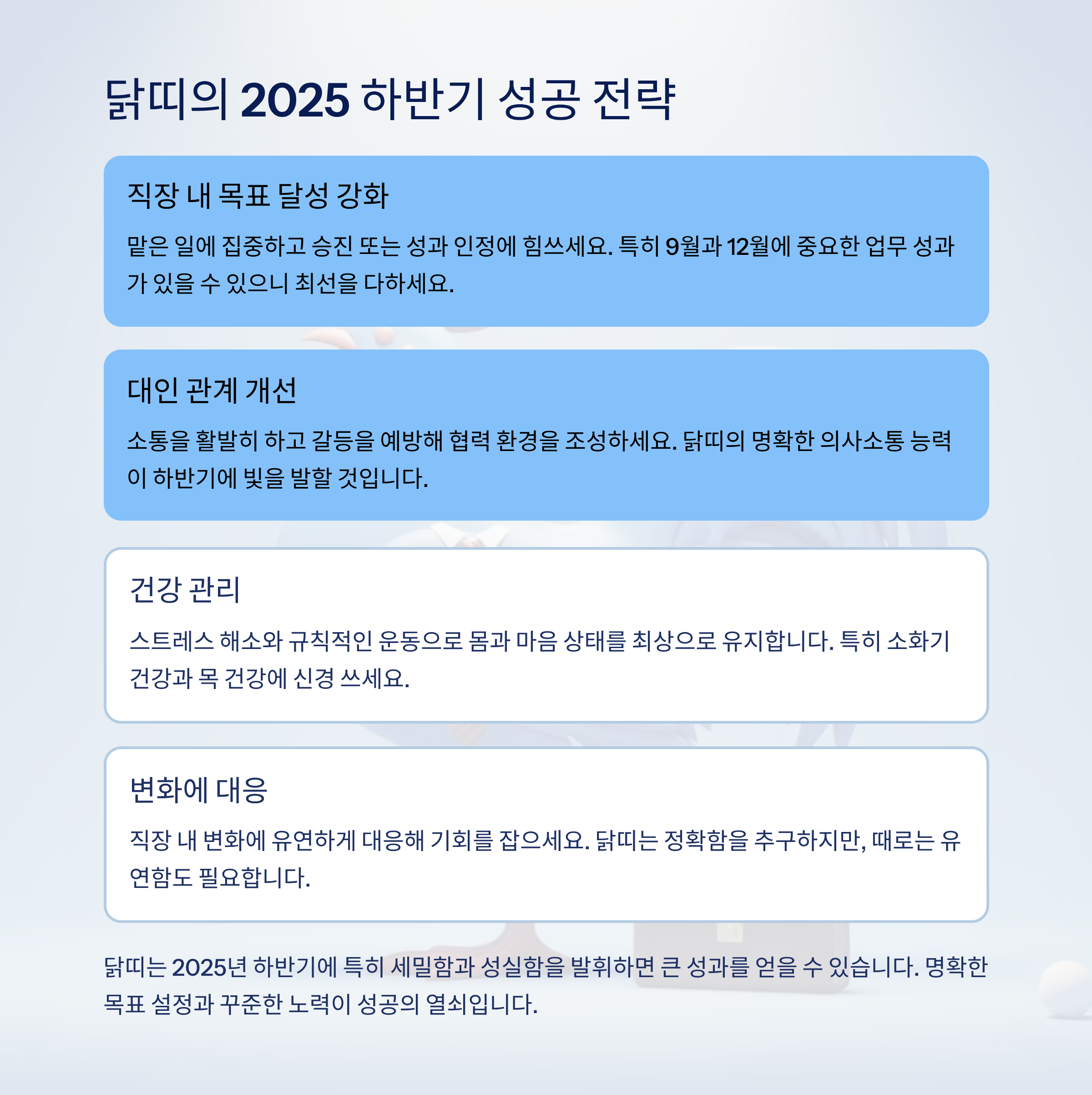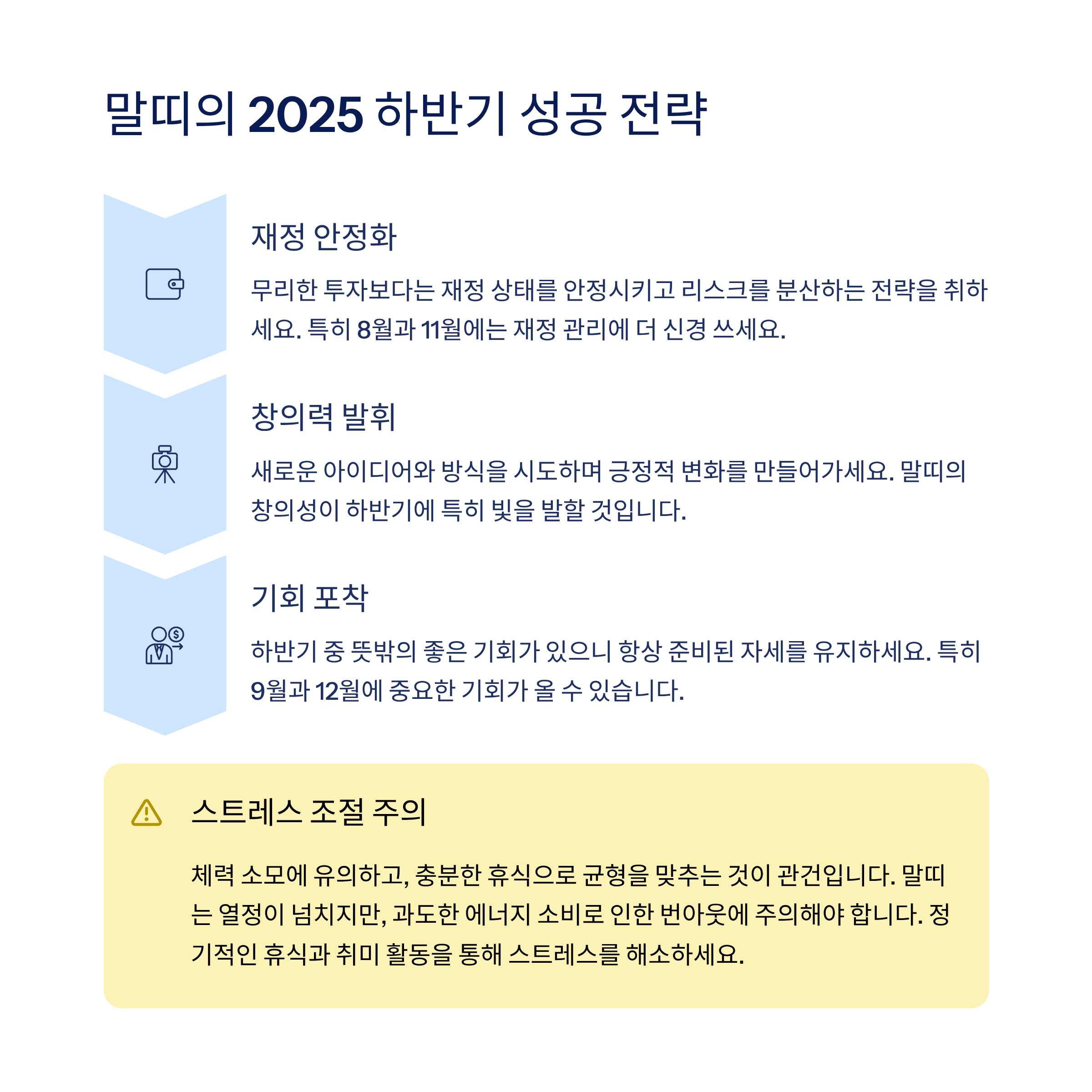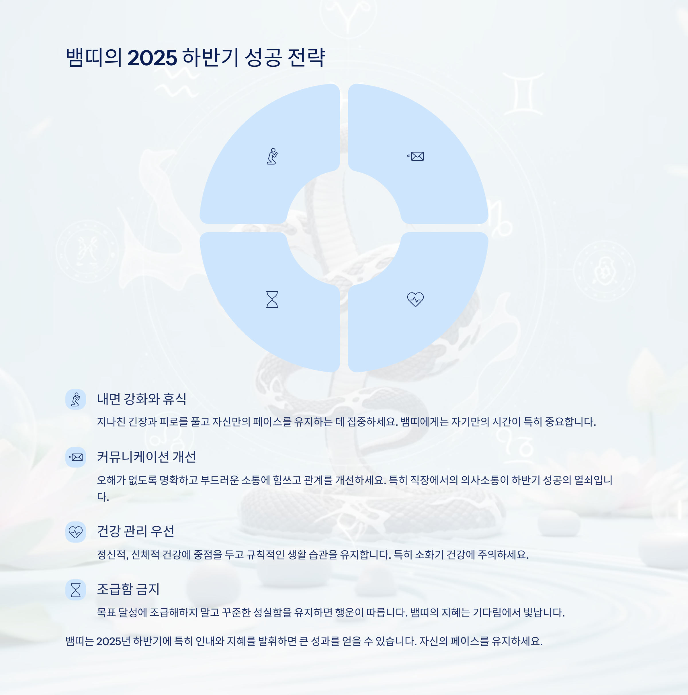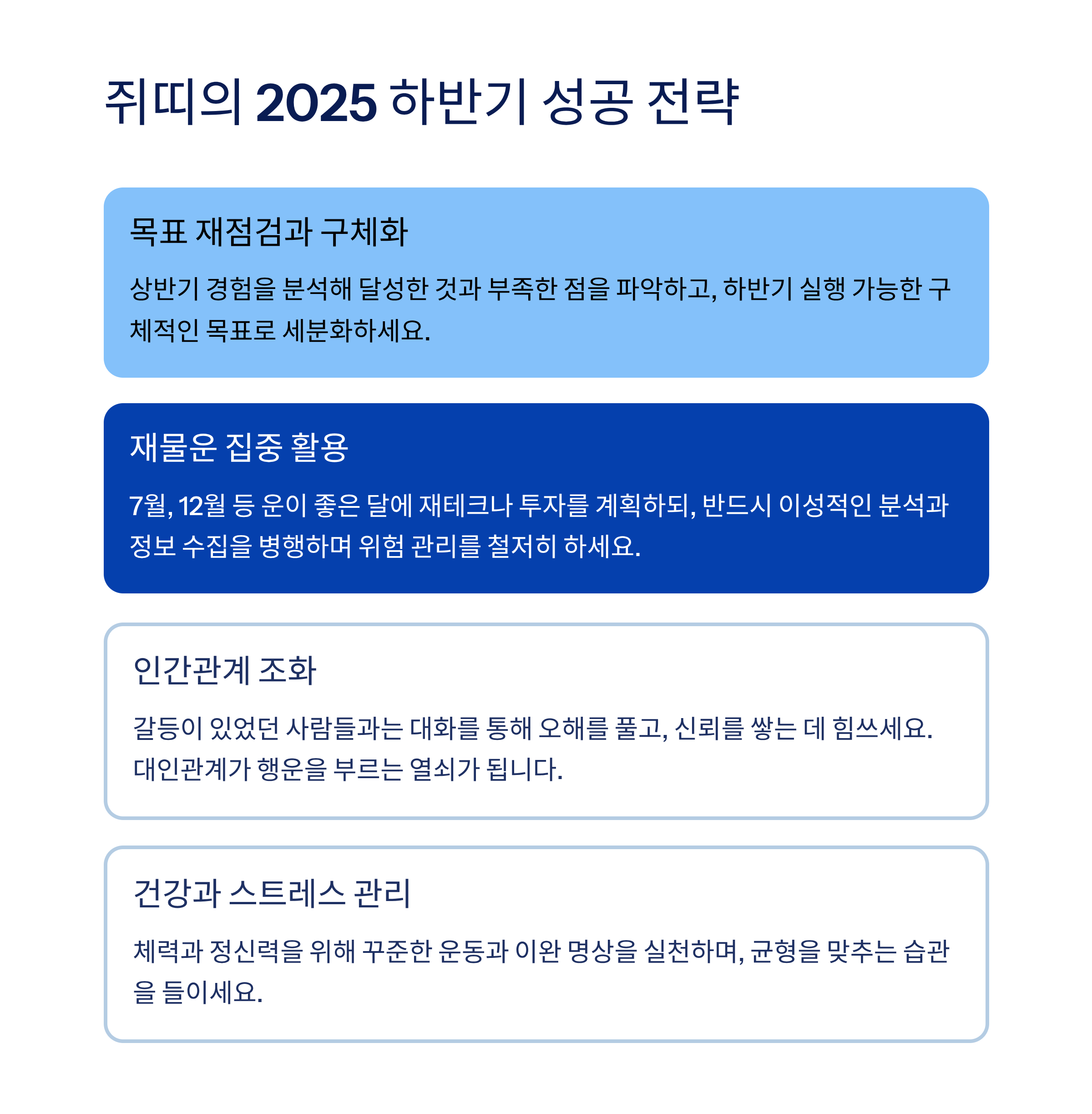 상세 전략들은 2025년 하반기의 긍정적인 운세 흐름을 고려해 각 띠별 맞춤형 목표 설정, 건강과 인간관계 관리, 상황별 행동 지침에 초점을 맞췄습니다.