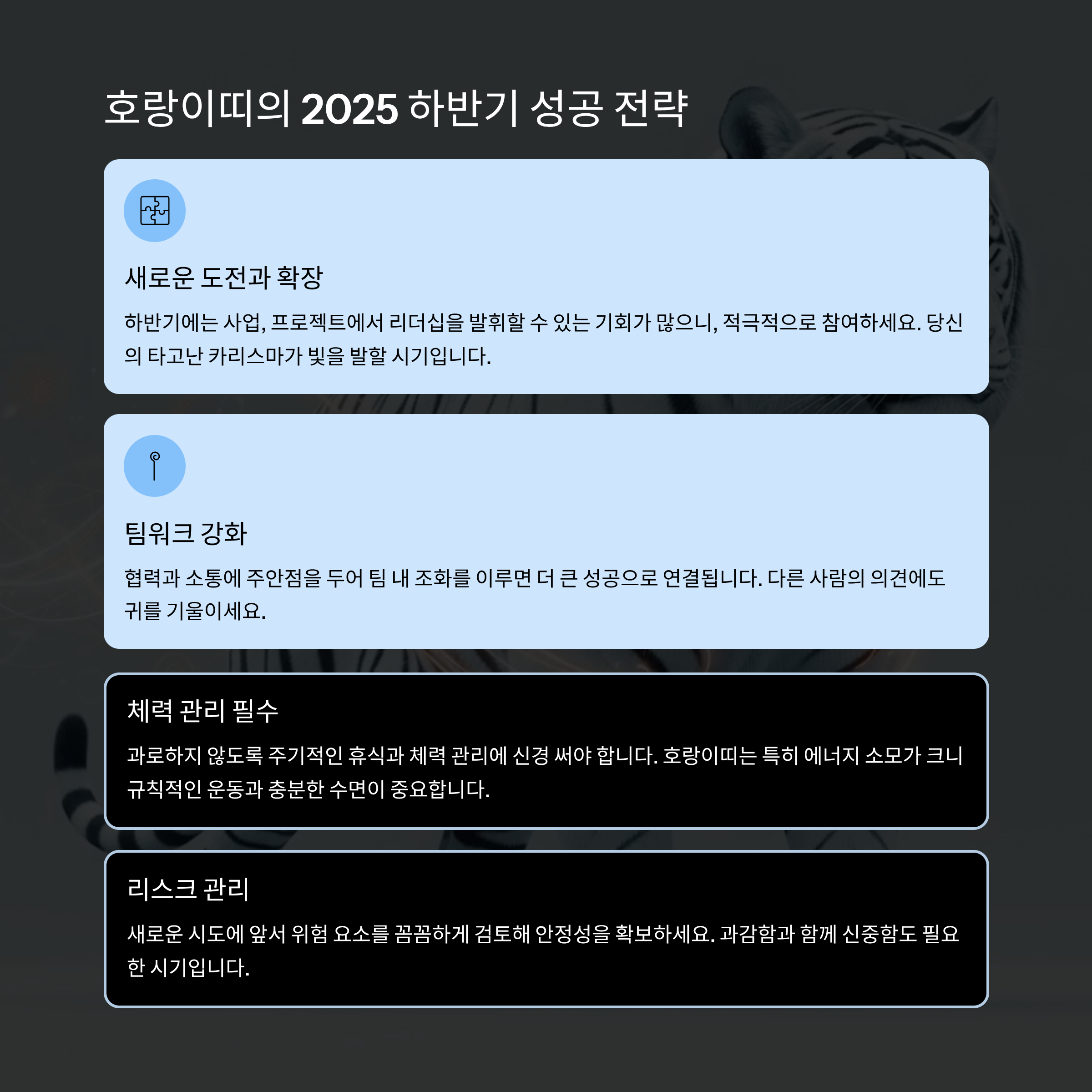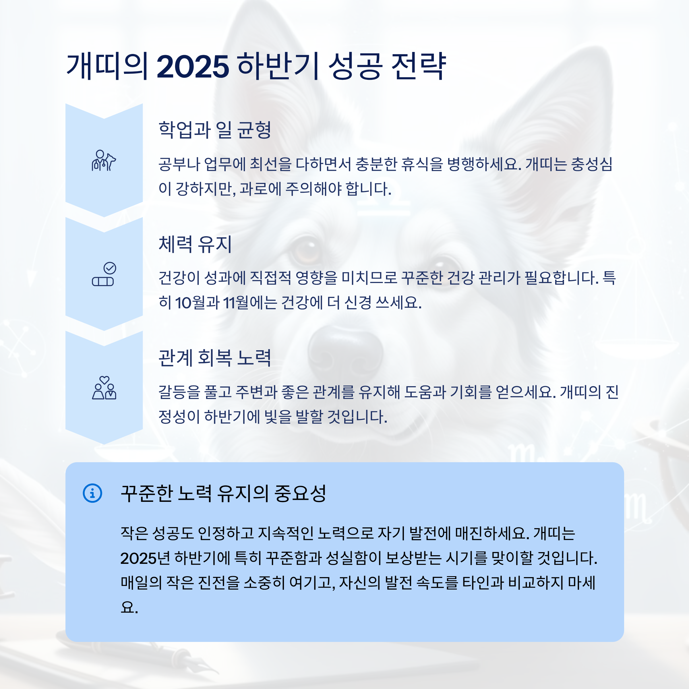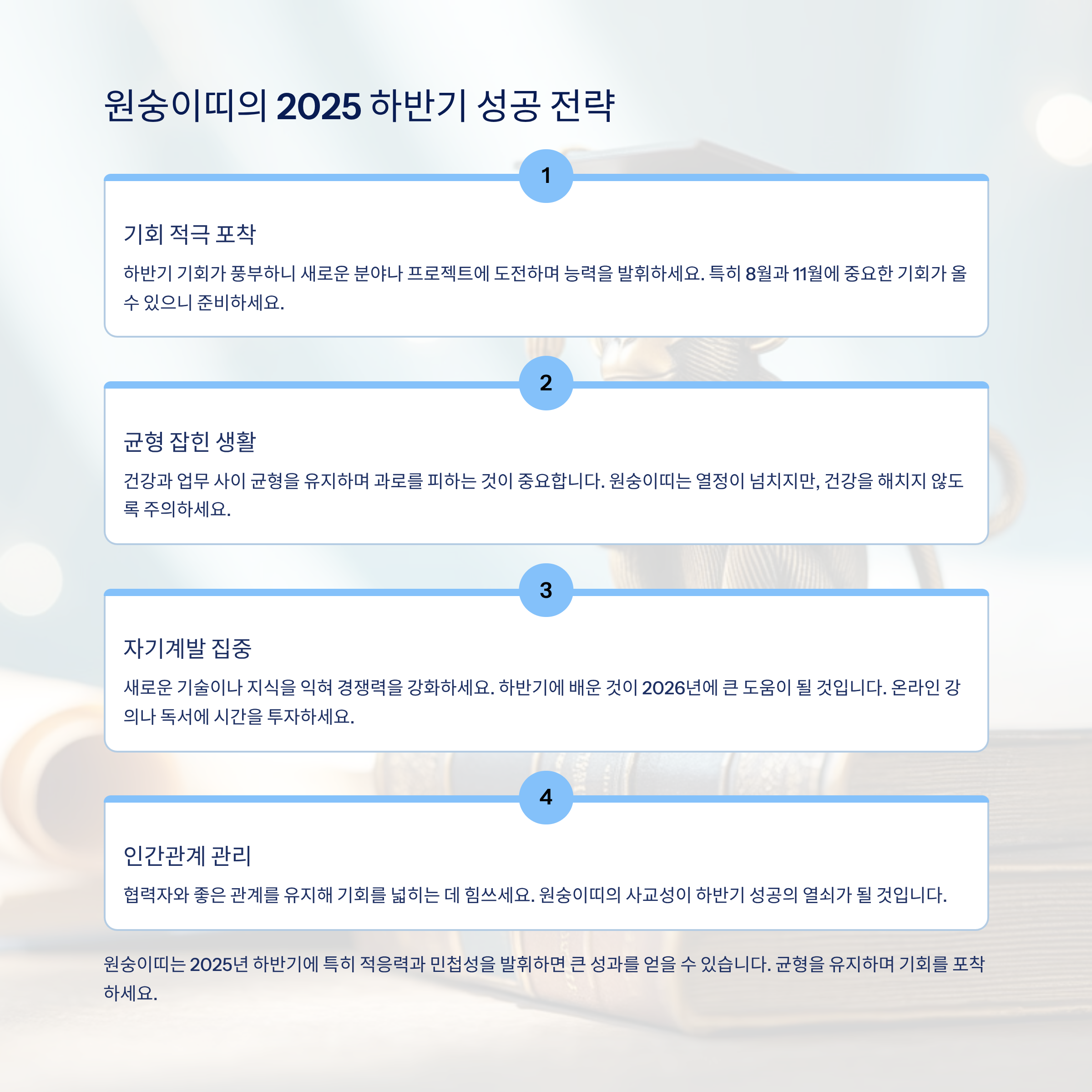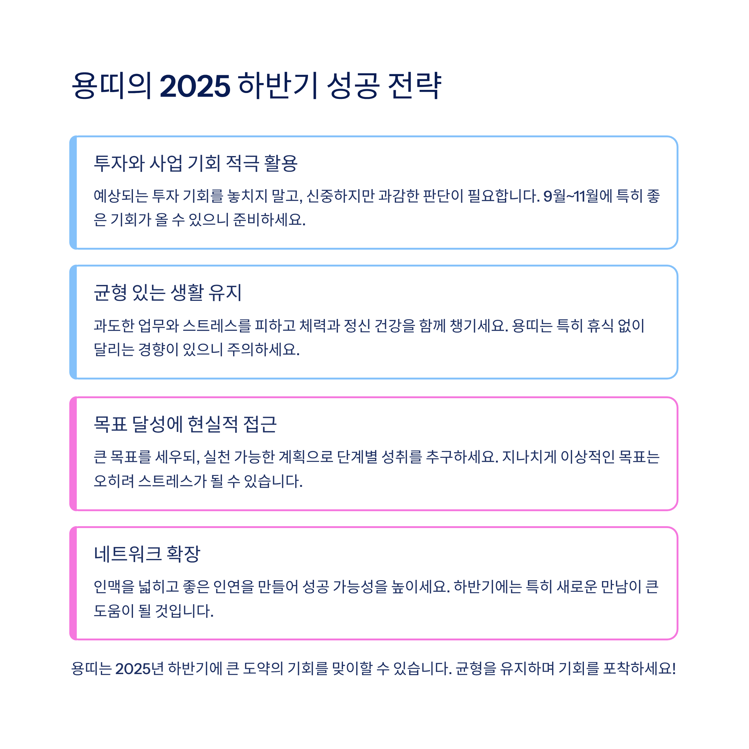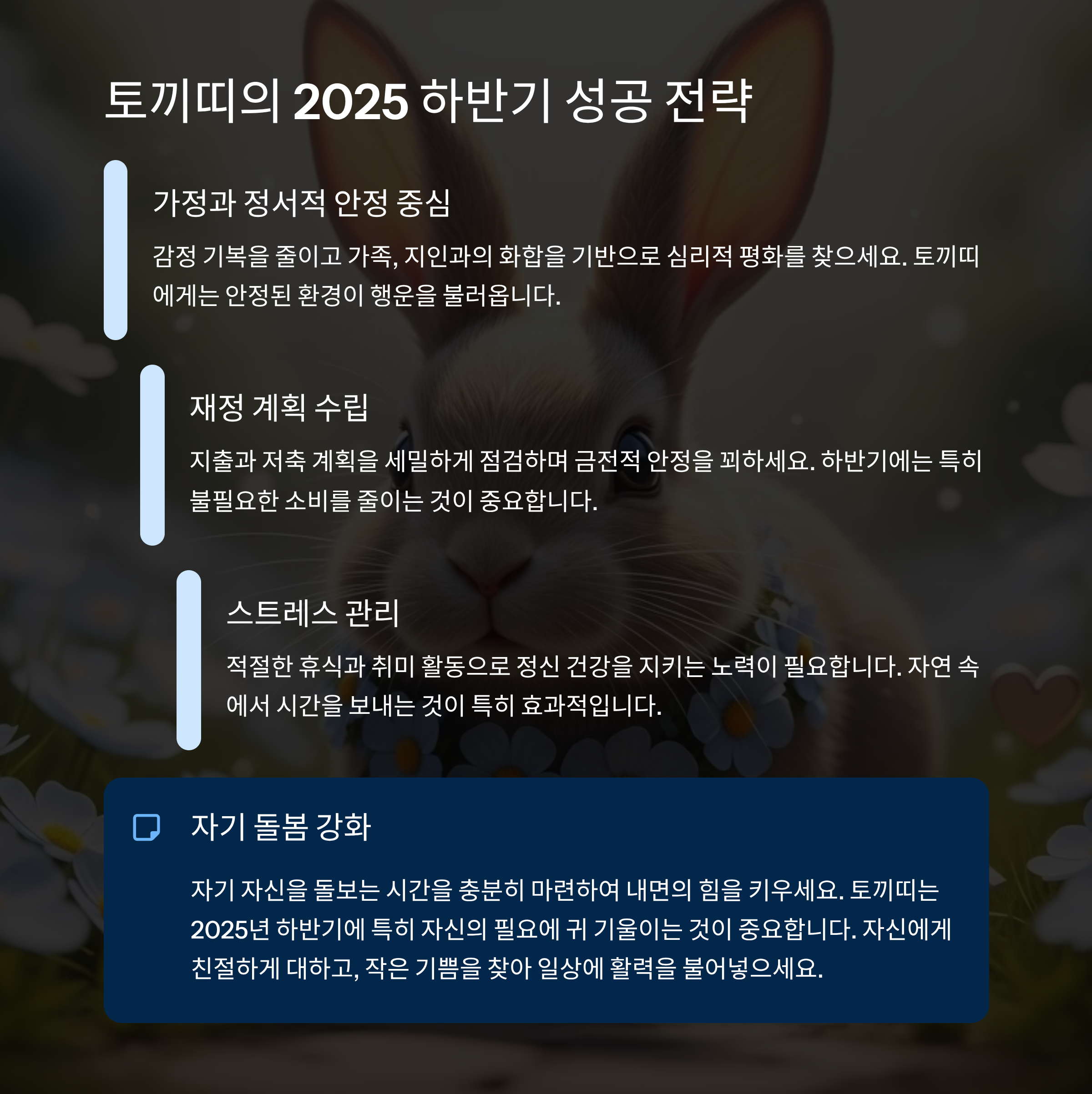 상세 전략들은 2025년 하반기의 긍정적인 운세 흐름을 고려해 각 띠별 맞춤형 목표 설정, 건강과 인간관계 관리, 상황별 행동 지침에 초점을 맞췄습니다.