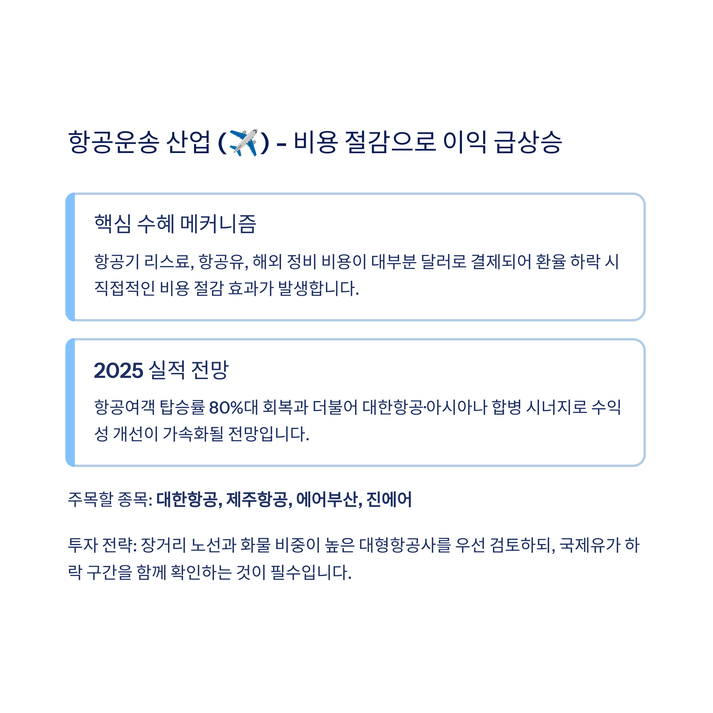 A: 수입 비중이 높은 기업엔 긍정적이지만, 수출 비중이 큰 기업은 채산성 악화로 부정적일 수 있습니다. - Q: 항공주가 환율 하락 시 가장 큰 수혜를 받는 이유는?