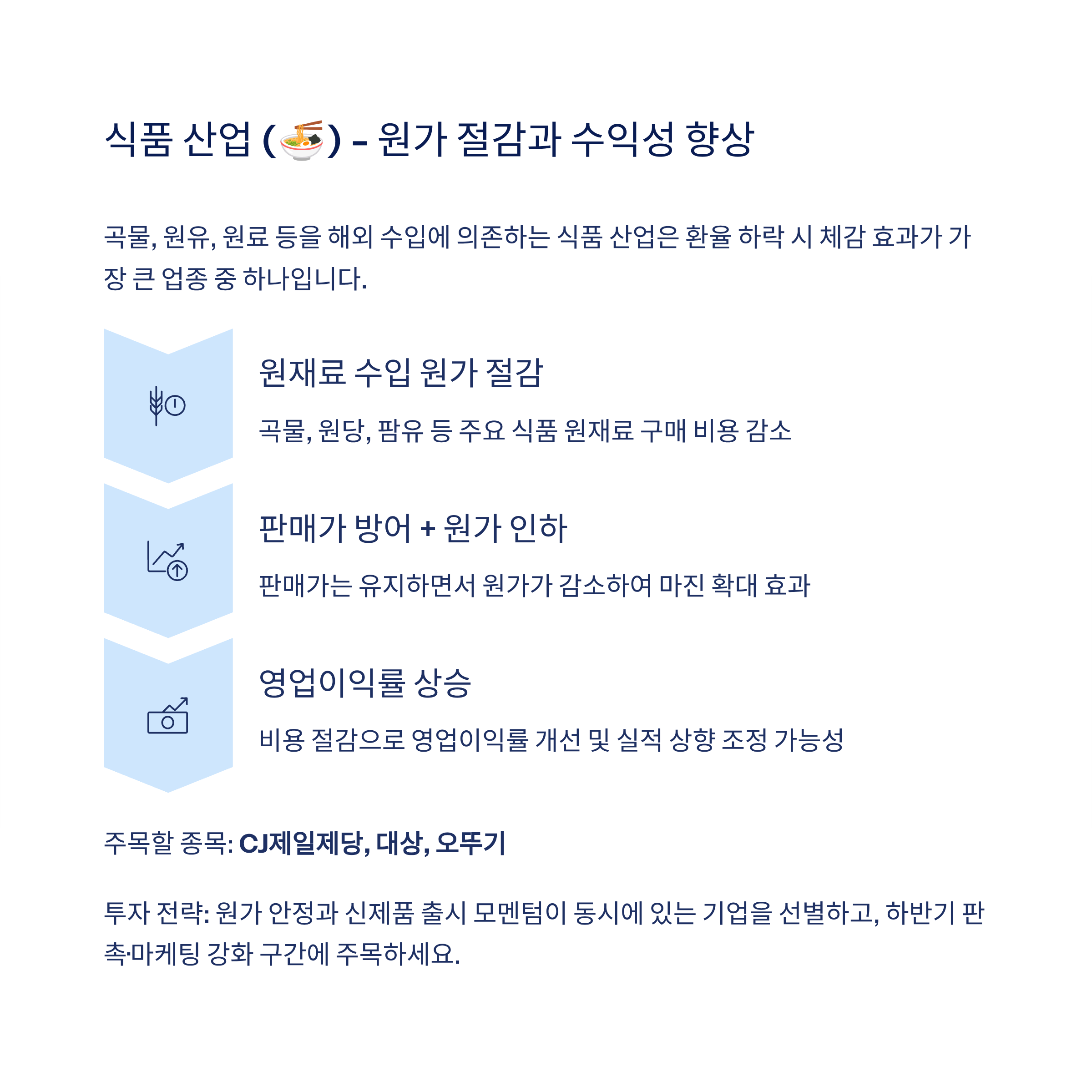 - 특징: 곡물·원유·원료 등을 해외 수입에 의존. 환율하락 혜택 체감도가 큼.