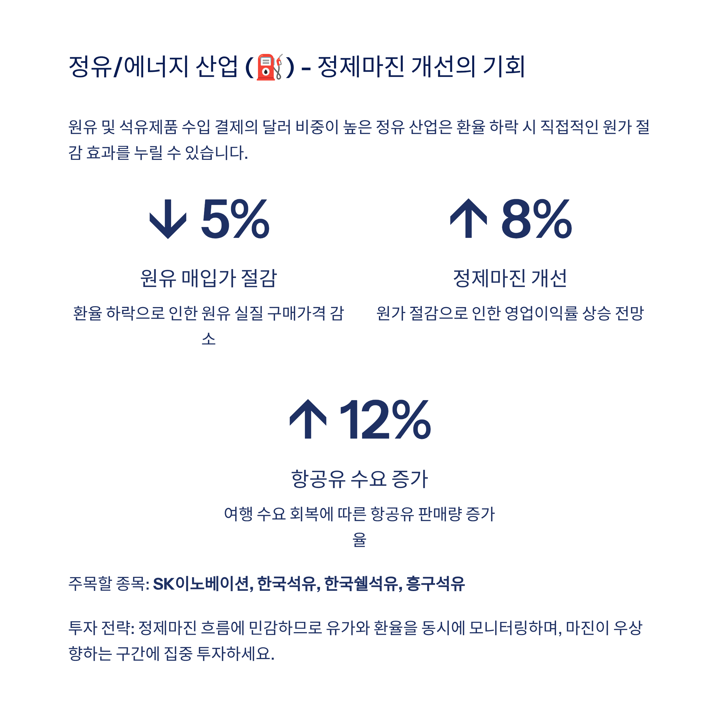 A: 리스료·연료비 대부분이 달러 결제라, 환율 하락이 곧바로 비용 절감으로 이어집니다. - Q: 정유/에너지 업종은 환율·유가 중 어느 쪽이 더 중요하나요?