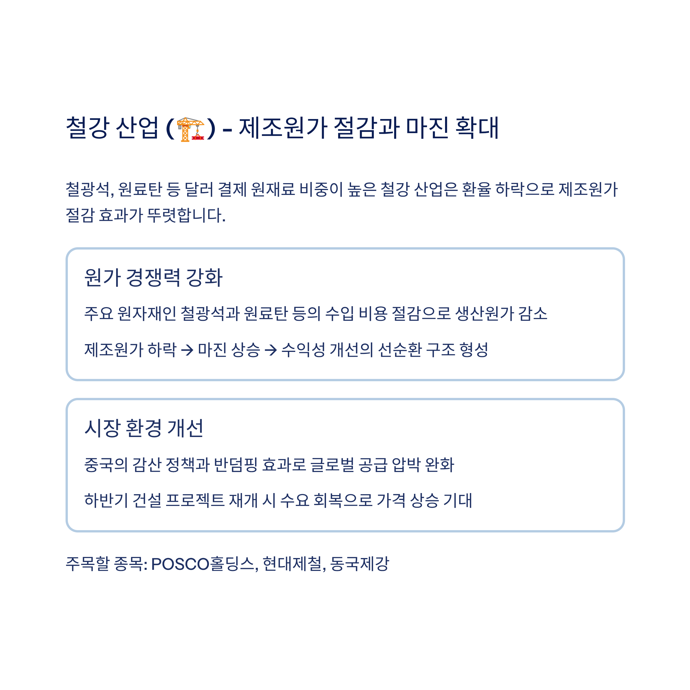 - 특징: 철광석·원료탄 등 달러 결제 원재료 비중 높음.