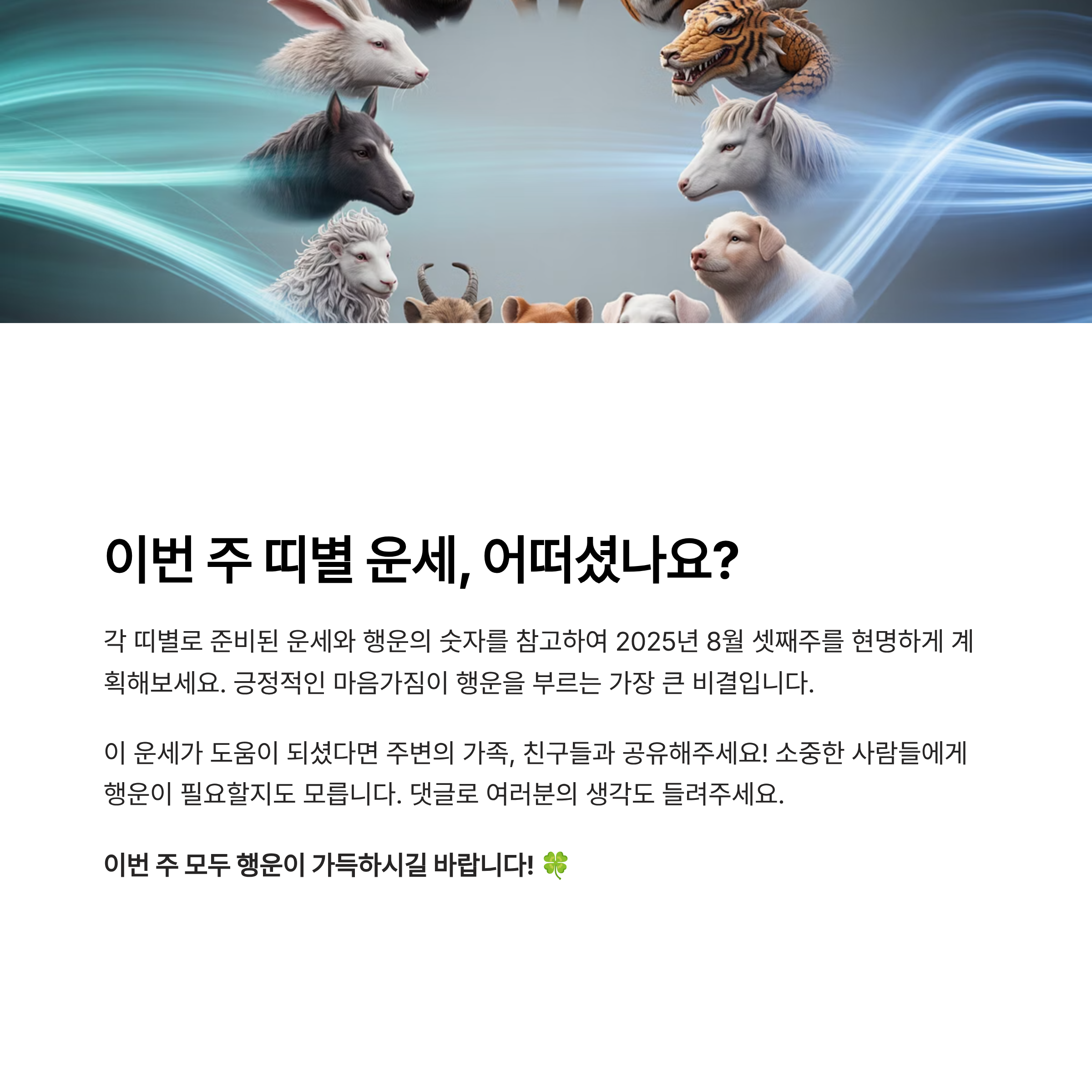 다가오는 2025년 8월 셋째주(8월 11일~8월 17일), 각 띠별로 어떤 운세의 흐름이 기다리고 있을까요? 계획적인 일 처리와 감정 컨트롤, 그리고 행운의 숫자를 어떻게 활용하느냐에 따라 한 주의 흐름이 바뀔 수 있습니다. 이번 주는 각 띠별로 다른 에너지와 메시지를 담고 있어, 미리 운세를 참고하여 현명한 판단과 선택을 하시기 바랍니다.