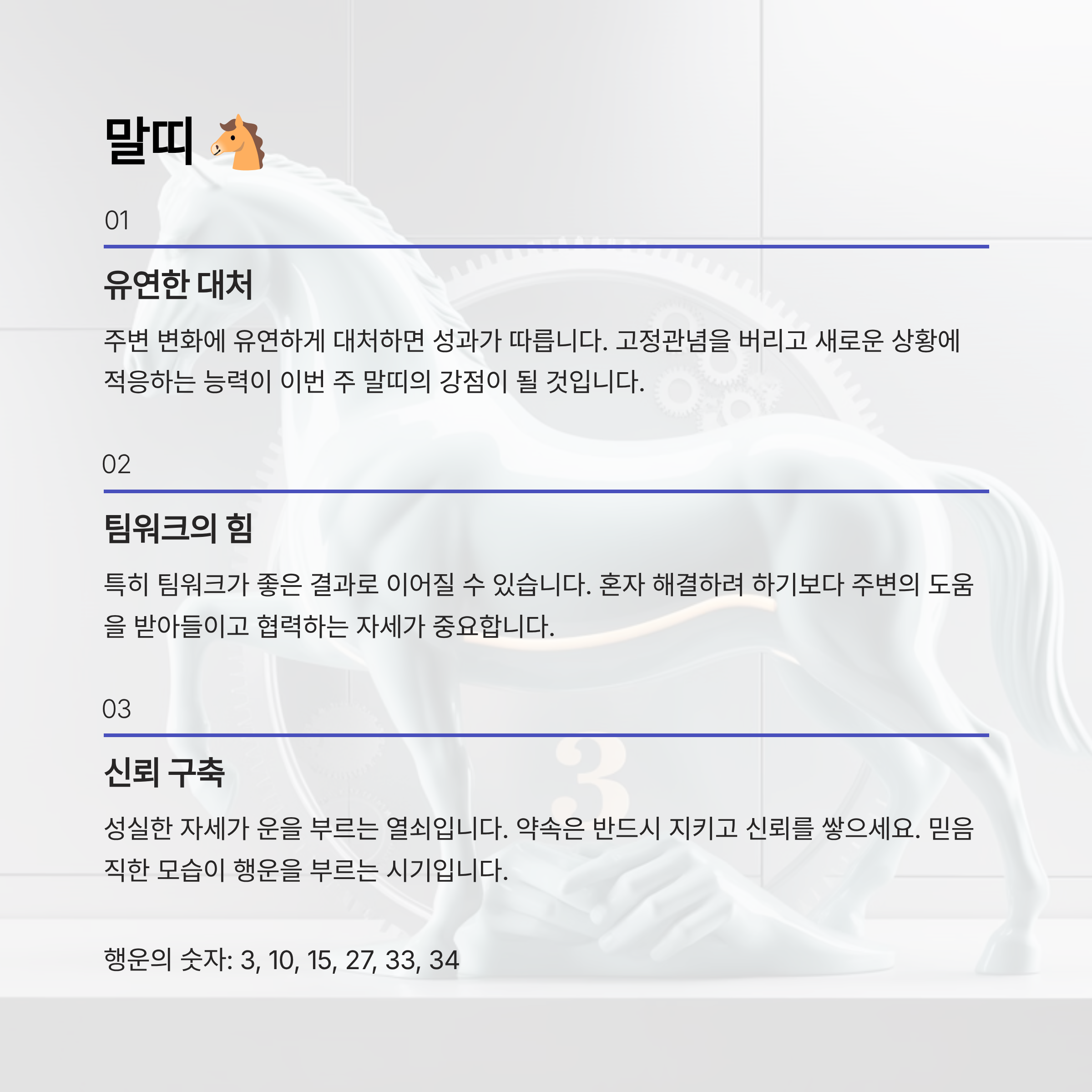 | 3위 | 말띠 🐴 | 변화 대응력 향상 + 협력운 + 성실 보상 운 |