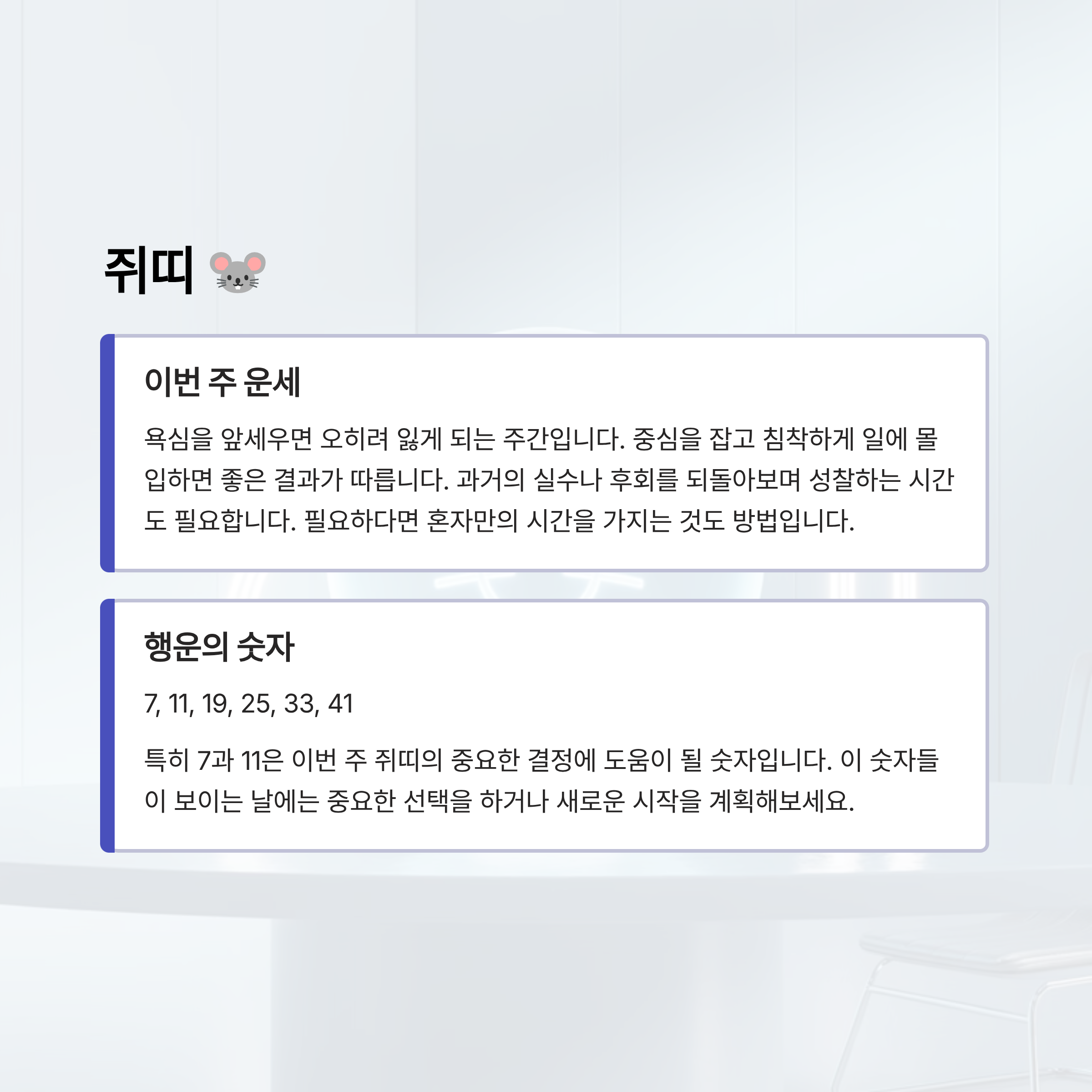 다가오는 2025년 8월 셋째주(8월 11일~8월 17일), 각 띠별로 어떤 운세의 흐름이 기다리고 있을까요? 계획적인 일 처리와 감정 컨트롤, 그리고 행운의 숫자를 어떻게 활용하느냐에 따라 한 주의 흐름이 바뀔 수 있습니다. 이번 주는 각 띠별로 다른 에너지와 메시지를 담고 있어, 미리 운세를 참고하여 현명한 판단과 선택을 하시기 바랍니다.
