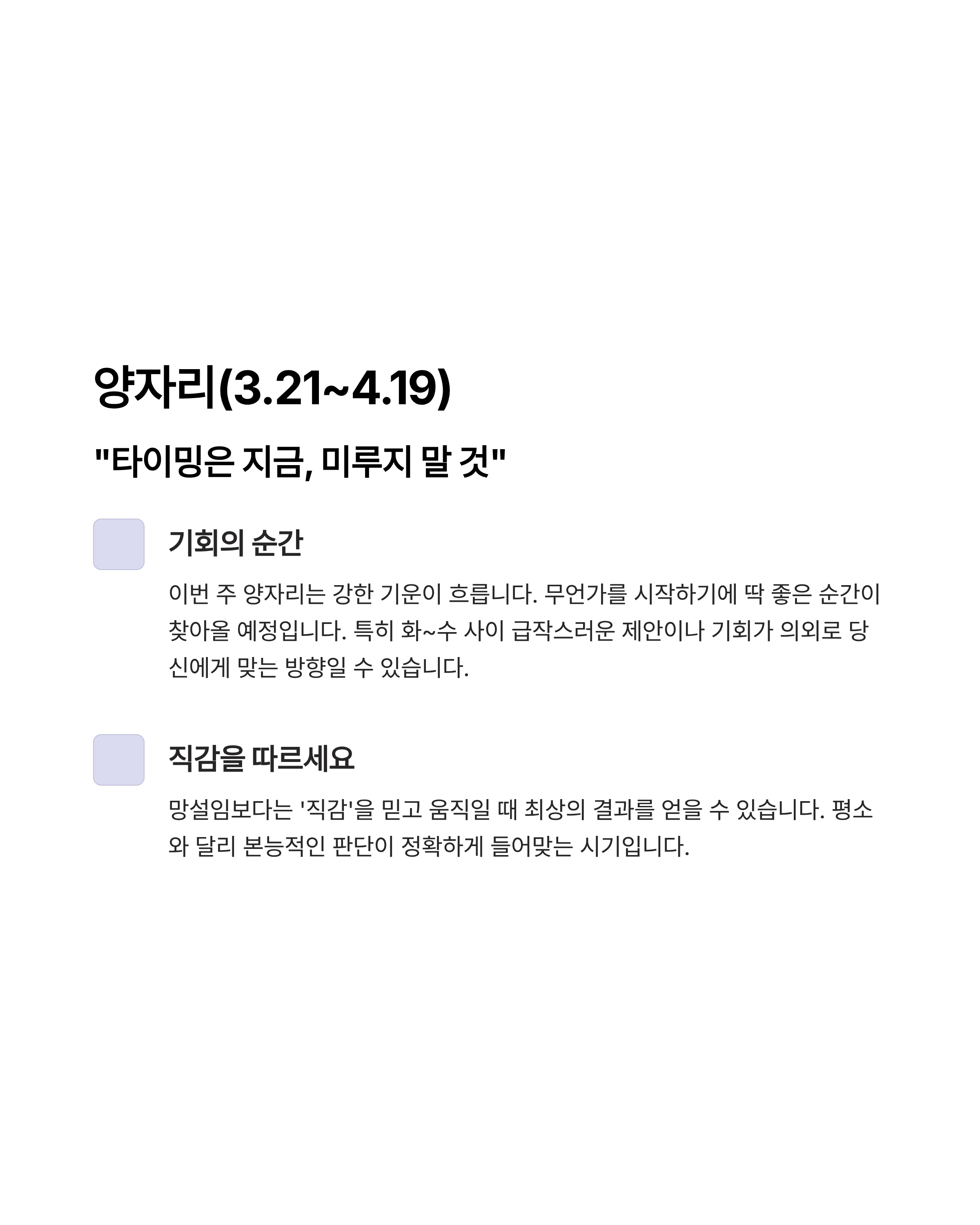 양자리(3.21~4.19) – "타이밍은 지금, 미루지 말 것"