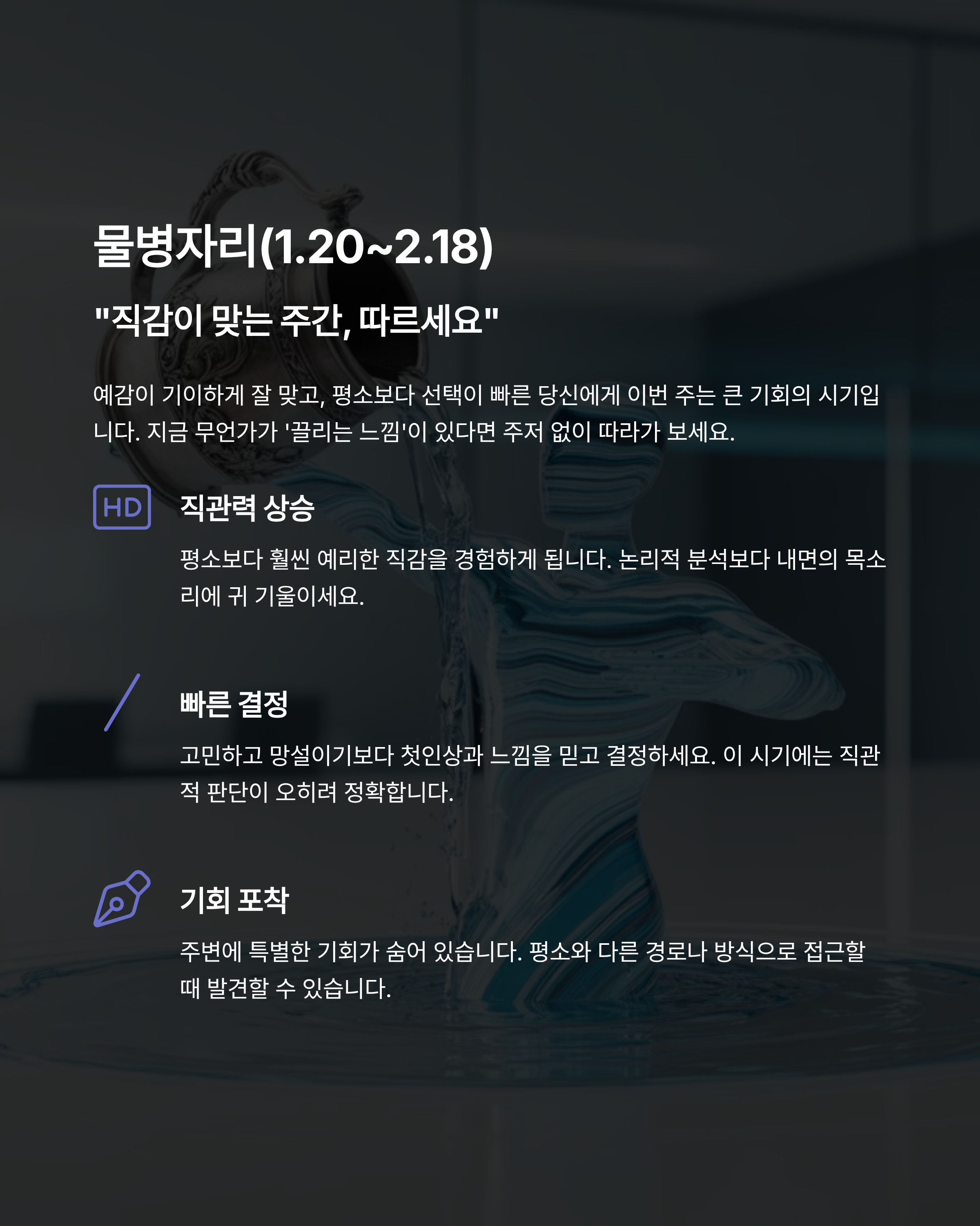 물병자리(1.20~2.18) – "직감이 맞는 주간, 따르세요"