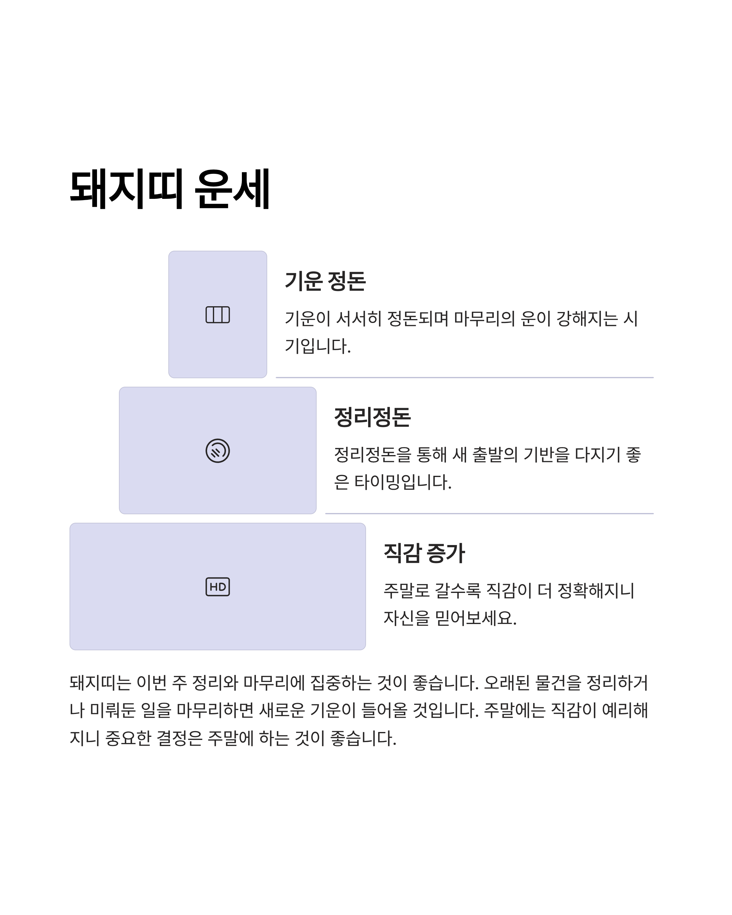 기운이 서서히 정돈되며 마무리의 운이 강해지는 시기입니다.