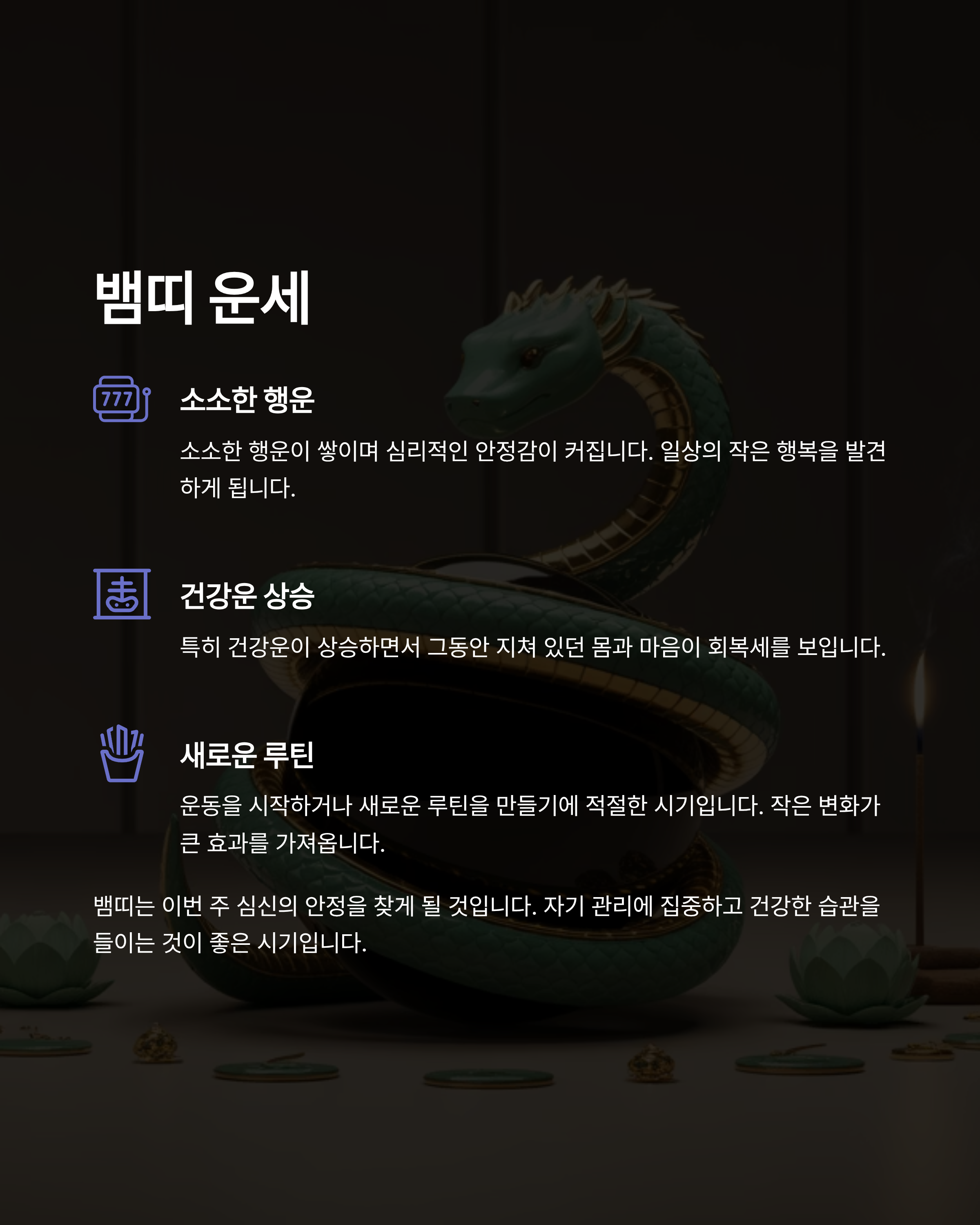연애운뿐 아니라 금전운도 회복세를 보입니다. 작은 투자가 복으로 돌아옵니다.